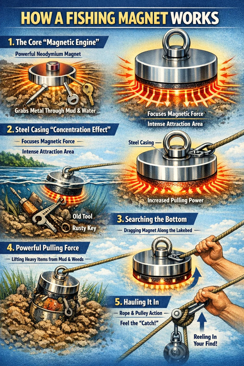 Para entender cómo un imán de pesca funciona, puedes imaginarlo como una "aspiradora submarina" superpoderosa, excepto que en lugar de polvo, aspira metal.