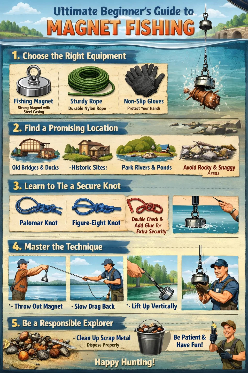 Probar la pesca con imanes es realmente muy sencillo; No necesitas ningún conocimiento avanzado de física ni una fuerza excepcional. Si tienes curiosidad por el mundo submarino, puedes empezar fácilmente siguiendo estos pasos: