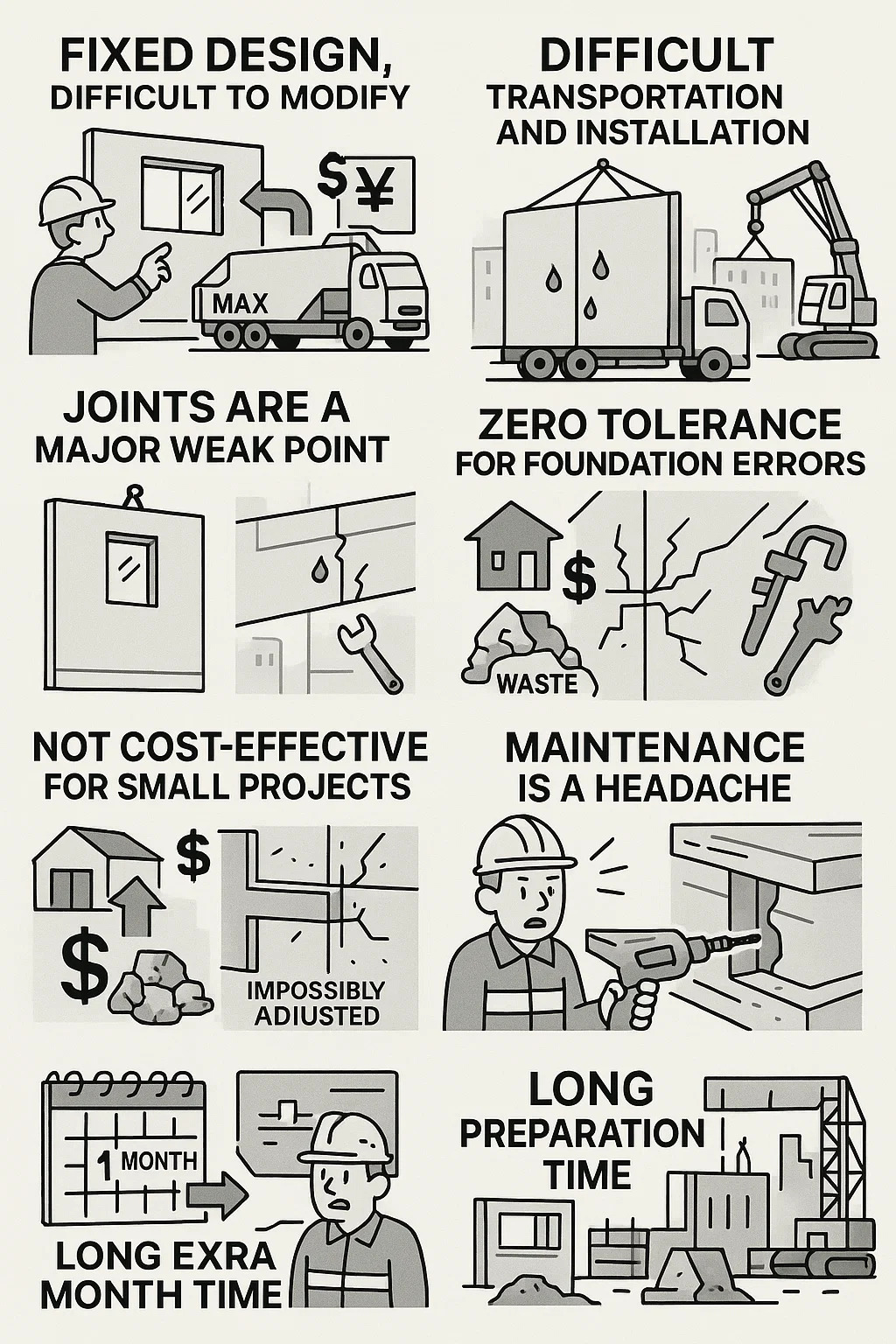 Limitaciones estrictas de tamaño: el tamaño máximo de los componentes está limitado por restricciones de transporte (por ejemplo, un camión no puede transportar un panel de pared de 4 metros de ancho), lo que hace imposibles las formas complejas.