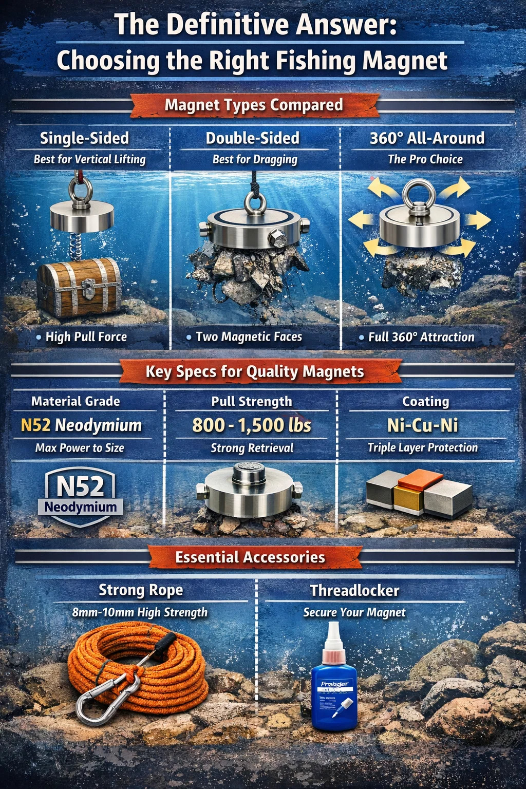 el Imán de neodimio de 360 grados Se considera ampliamente la mejor opción para los entusiastas serios porque ofrece atracción magnética desde todos los ángulos, lo que aumenta significativamente las posibilidades de captura. Para principiantes, un imán de pesca de doble cara Proporciona el mejor equilibrio entre costo, peso y efectividad. El material del núcleo siempre debe ser Neodimio (NdFeB) , específicamente el grado N52, ya que proporciona la relación potencia-tamaño más alta disponible en la tecnología moderna.