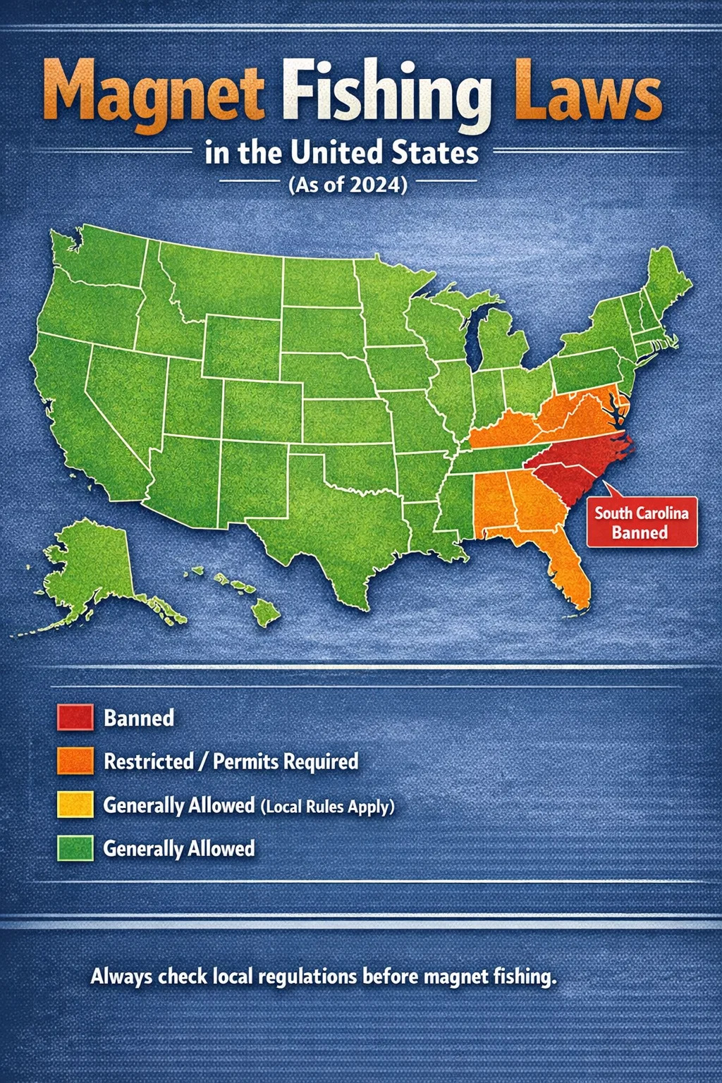 La mayoría de los estados de EE. UU. permiten actualmente la pesca con imanes sin que exista una prohibición específica a nivel estatal. A partir de 2024, Sólo Carolina del Sur tiene una prohibición estatal explícita de la pesca con imanes. , lo que lo convierte en el claro caso atípico. Sin embargo, "permitido de forma predeterminada" no significa que no tenga restricciones. Docenas de estados tienen regulaciones sobre vías navegables, requisitos de permisos u ordenanzas locales que afectan directamente dónde y cómo se puede utilizar un imán de pesca. Antes de atar un imán de neodimio a una cuerda y arrojarlo a un río, debe comprender no solo las leyes estatales sino también las reglas del condado, la propiedad de la tierra y la masa de agua específica a la que se dirige.
