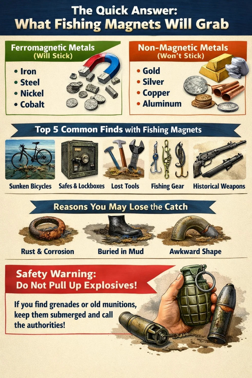 mientras imanes de pesca son herramientas de descubrimiento, también pueden encontrar peligros. En muchas partes de Europa y algunas partes de Estados Unidos, se pueden extraer municiones sin detonar (MUSE), como granadas o viejos proyectiles de mortero. Estos elementos aún pueden estar activos y ser extremadamente peligrosos. Si ves algo que parece un explosivo, no lo toques , mantenlo sumergido si es posible y llama al escuadrón antiexplosivos inmediatamente.