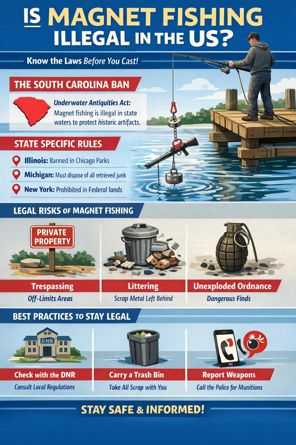 La pesca con imán es no es ilegal a nivel federal en los Estados Unidos, pero está estrictamente regulado o completamente prohibido en estados, ciudades y jurisdicciones específicos. La prohibición más notable está en carolina del sur , donde la Ley de Antigüedades Subacuáticas prohíbe el uso de un imán de pesca para recolectar artefactos de aguas estatales. En otros estados, la legalidad depende de las leyes locales sobre intrusión, protecciones ambientales y mandatos del Departamento de Recursos Naturales (DNR).